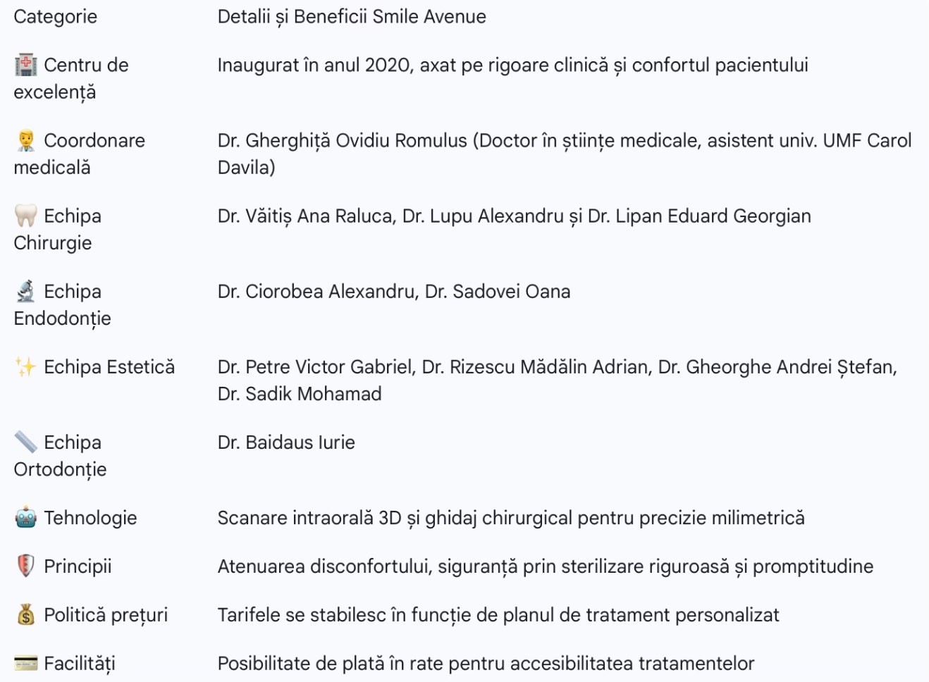 Misiunea centrului este îmbunătățirea continuă a calității serviciilor prin inovație și o abordare empatică a relației medic-pacient. La Smile Avenue, fiecare plan de tratament este construit pe comunicare și profesionalism, oferind un mediu relaxant în care frica de medicul stomatolog este înlocuită de o experiență clinică predictibilă și sigură.